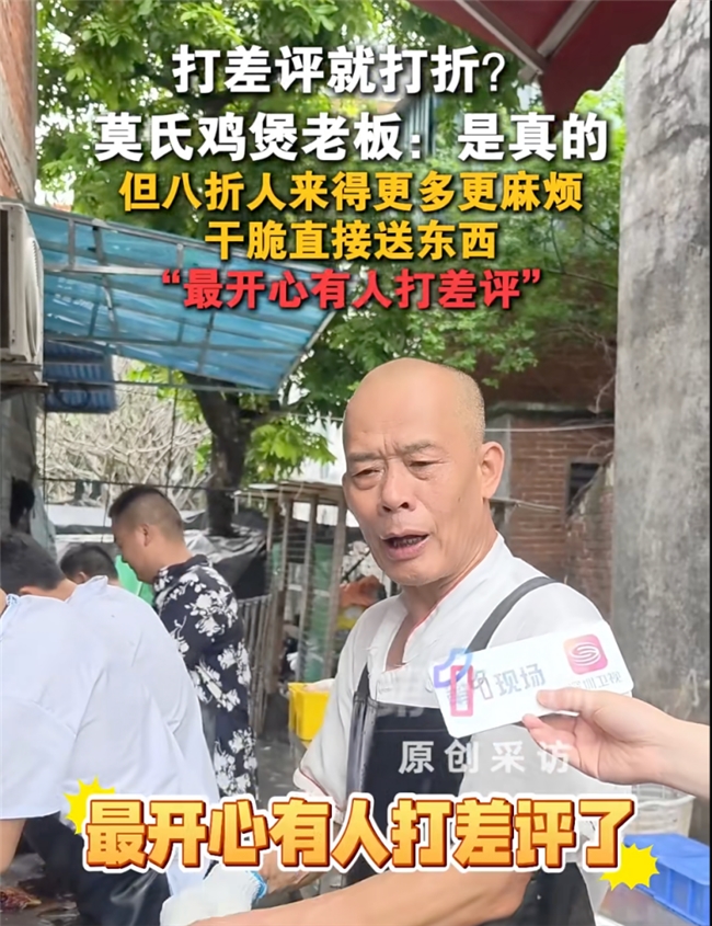 广东佛山顺德的莫氏鸡煲因店主莫叔在美食博主探店时,一句"别拍太火,我忙不过来"的随性发言一夜之间成为现象级网红餐馆。但莫叔本人一点都不高兴,而是对着镜头疯狂劝退:“鸡都是冰冻鸡,很难吃,不要过来吃”、“差评打8折”……