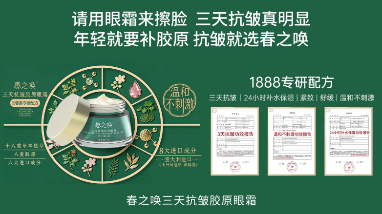 如今,承载品牌科研实力、官方认可与市场厚望的春之唤三天抗皱胶原眼霜震撼上市,以高配配方、硬核功效、超大规格50g每瓶包装,开启全眼全脸抗皱护肤新纪元,全力深耕赋能全国CS实体渠道!