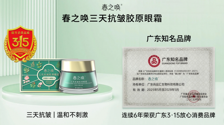 从广东315权威加冕、官方峰会认可,到百万用户口碑积淀;从顶配科研配方、硬核实测功效,到超大亲民规格;春之唤三天抗皱胶原眼霜凭借全维度硬核优势,已然成为2026年线下美妆渠道必抢爆款!未来,春之唤将持续坚守诚信初心、深耕品质研发,全力赋能实体终端,让更多女性轻松解锁紧致嫩肌。春之唤,唤醒肌肤年轻之美。