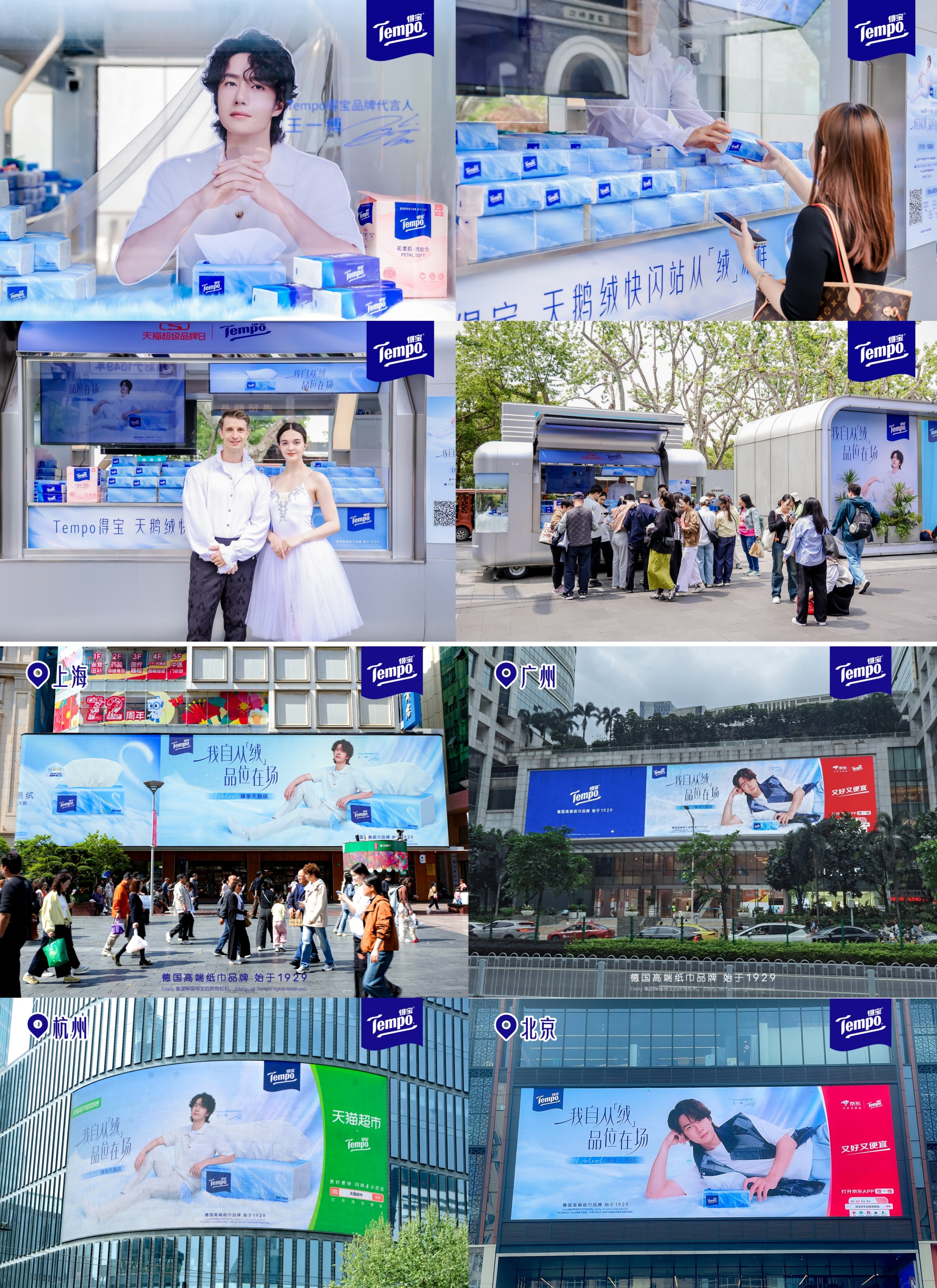 依托明星热度,Tempo得宝同步启动全域线下霸屏战略,打造沉浸式“从绒”体验场。品牌在北京、上海、广州、杭州、成都、深圳、苏州七城核心地标上线九屏巨幕,在深圳、上海、杭州三城CBD核心地铁站点投放超长屏广告,将天鹅绒系列的高端视觉符号覆盖城市核心流量阵地。与此同时,杭州湖畔专属天鹅绒快闪空间惊喜启幕,优雅的芭蕾模特现场互动派样,让消费者直观感受产品的柔软质感与高端品位。线上话题传播与线下实景体验双向共振,让臻享天鹅绒系列的高端形象深入人心,实现品牌声量的全域扩散。