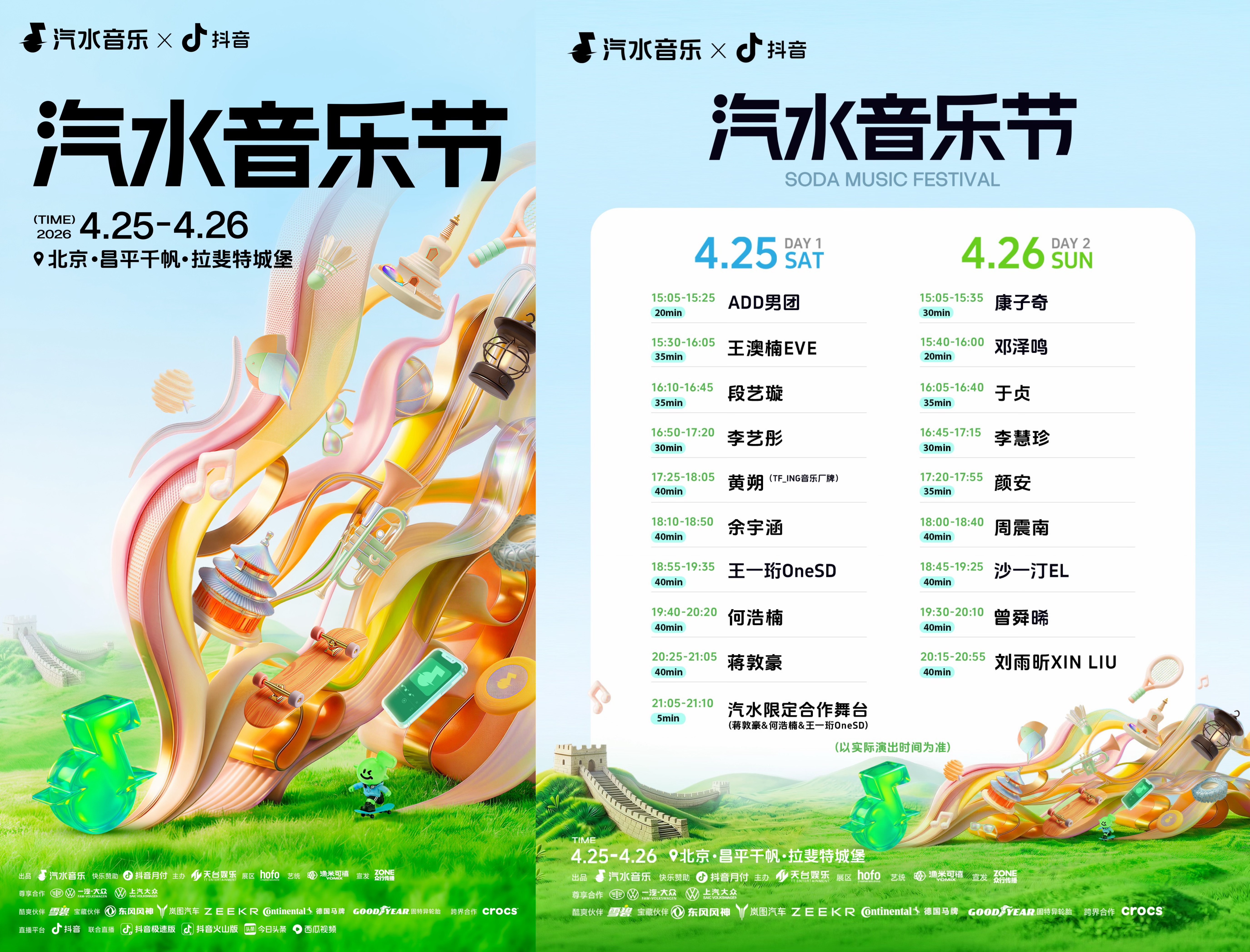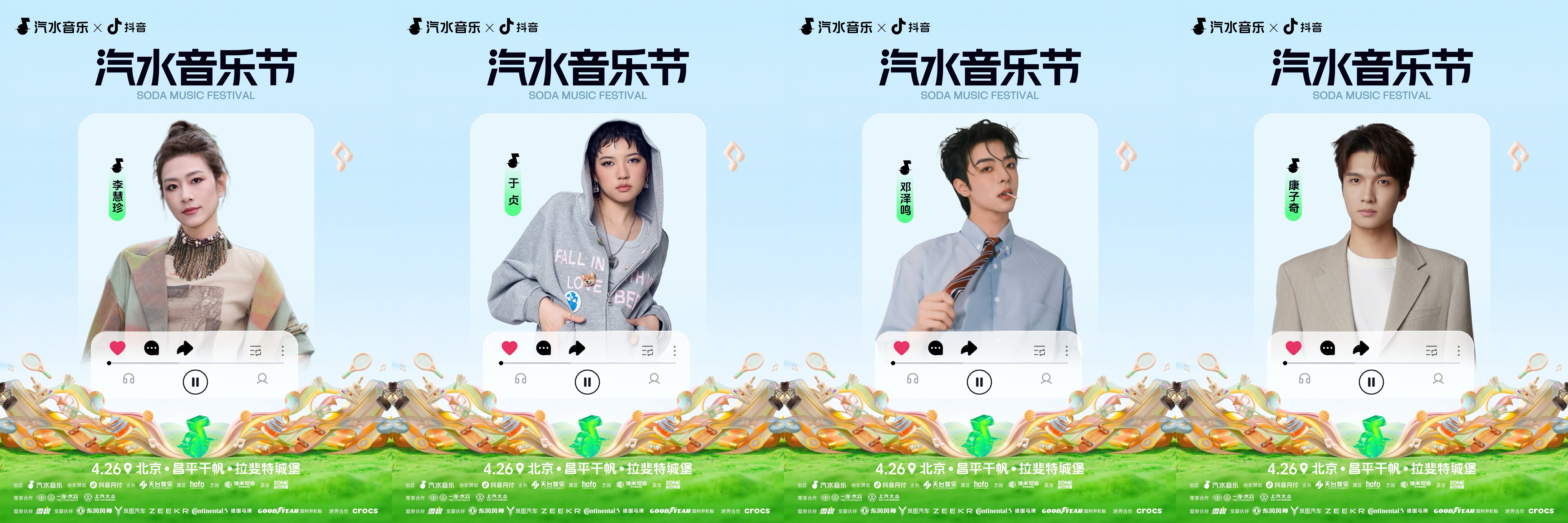 4月26日:舞台能量持续飙升,康子奇、邓泽鸣将率先登场唤醒感官,随后由于贞、李慧珍、颜安接力献唱。周震南、沙一汀EL带来的先锋音浪将不断冲击耳膜,曾舜晞、刘雨昕XIN LIU将以强烈的个人舞台张力,为这场为期两天的演出画下惊艳句点。