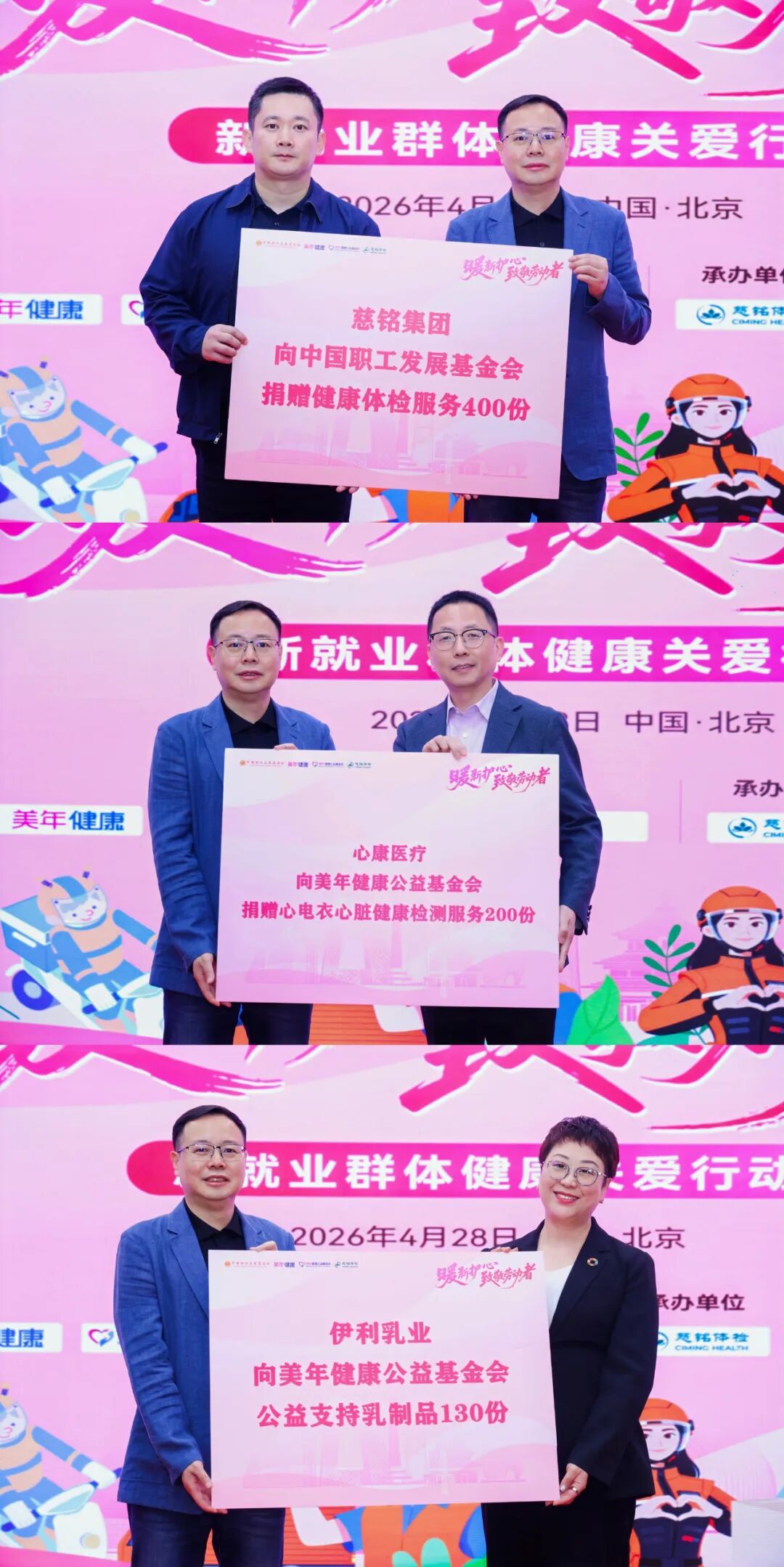 在“五一”国际劳动节即将到来之际,为切实守护外卖骑手、快递小哥、网约车及城市货运司机等新就业形态劳动者身心健康,2026 年 4 月 28日,由中国职工发展基金会公益支持,美年健康集团、美年健康公益基金会联合发起,慈铭集团承办的“暖新护心・致敬劳动者——新就业群体健康关爱行动”在北京慈铭奥亚医院正式启动。