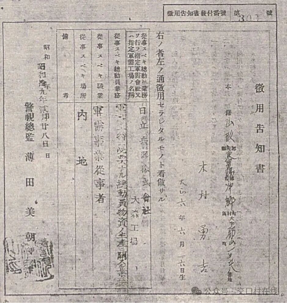 木村勇吉日本山形县人,1938年11月征招入伍来到中国,1939年11月编入新组建的日军独立混成第十六旅团第八十六大队第四中队二小队,任卫生兵驻防交口村。