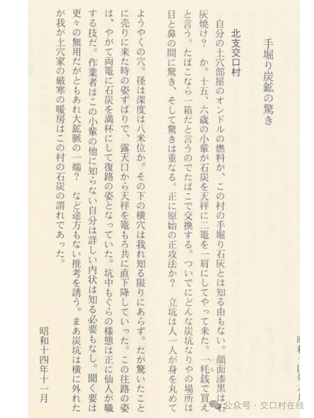 全然不知自己土窑屋的燃料,竟是此村人工开采的石炭。满面漆黑就像是石炭灼烧所致?十五六岁的少年用扁担挑着两筐石炭而来,言道一毫钱可购,若以香烟则需一箱。遂以烟草相易。顺带问及石炭坑所在,竟然近在咫尺,令人惊异不已,惊奇接连涌现。岂非原始正统之法?竖井仅容一人蜷身勉强通过,井径深浅约八米许,其下横穴非我所知。然更令人惊愕的是——转眼间少年已将两筐装满石炭踏上归途。井下作业如鼹鼠潜行,实乃仙人之技。除却此少年,未见其他作业者。我亦无需了解内情,追问更属无益。然终不禁遥想:莫非此乃巨大矿脉一隅?纵使炭坑稍偏。我土窑屋严冬取暖之源,原是此村石炭所赐。