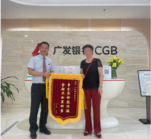 2025年8月13日,任阿姨特意携带印有“争分夺秒阻诈骗 金融卫士显担当”的锦旗来到广发银行东莞分行账户归属网点致谢,对银行的科技防诈能力与工作人员的高度责任感给予高度评价。