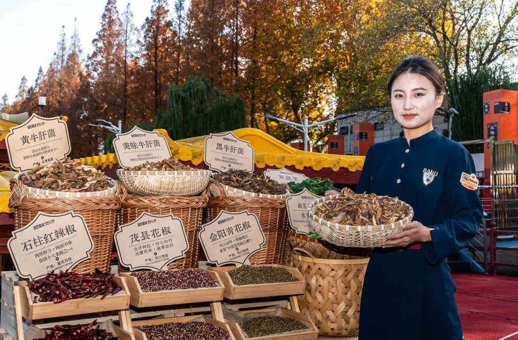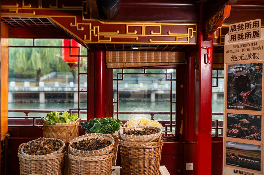 在秦淮河畔的粉墙黛瓦之间,巴奴的展陈别具匠心。秦淮河画舫的展台设计巧妙融合了川渝地区的热辣与江南风情的雅致意趣。四川金阳的青花椒、重庆石柱的红辣椒、云南的野山菌、内蒙古锡林郭勒的乌珠穆沁羊肉、河南温县的铁棍山药……每一种食材都清晰地标注其原产地、生长环境与严格的选品标准。许多游客在参展后,随即通过手机地图搜索最近的巴奴门店,实现了从“观展体验”到“消费打卡”的无缝衔接。
