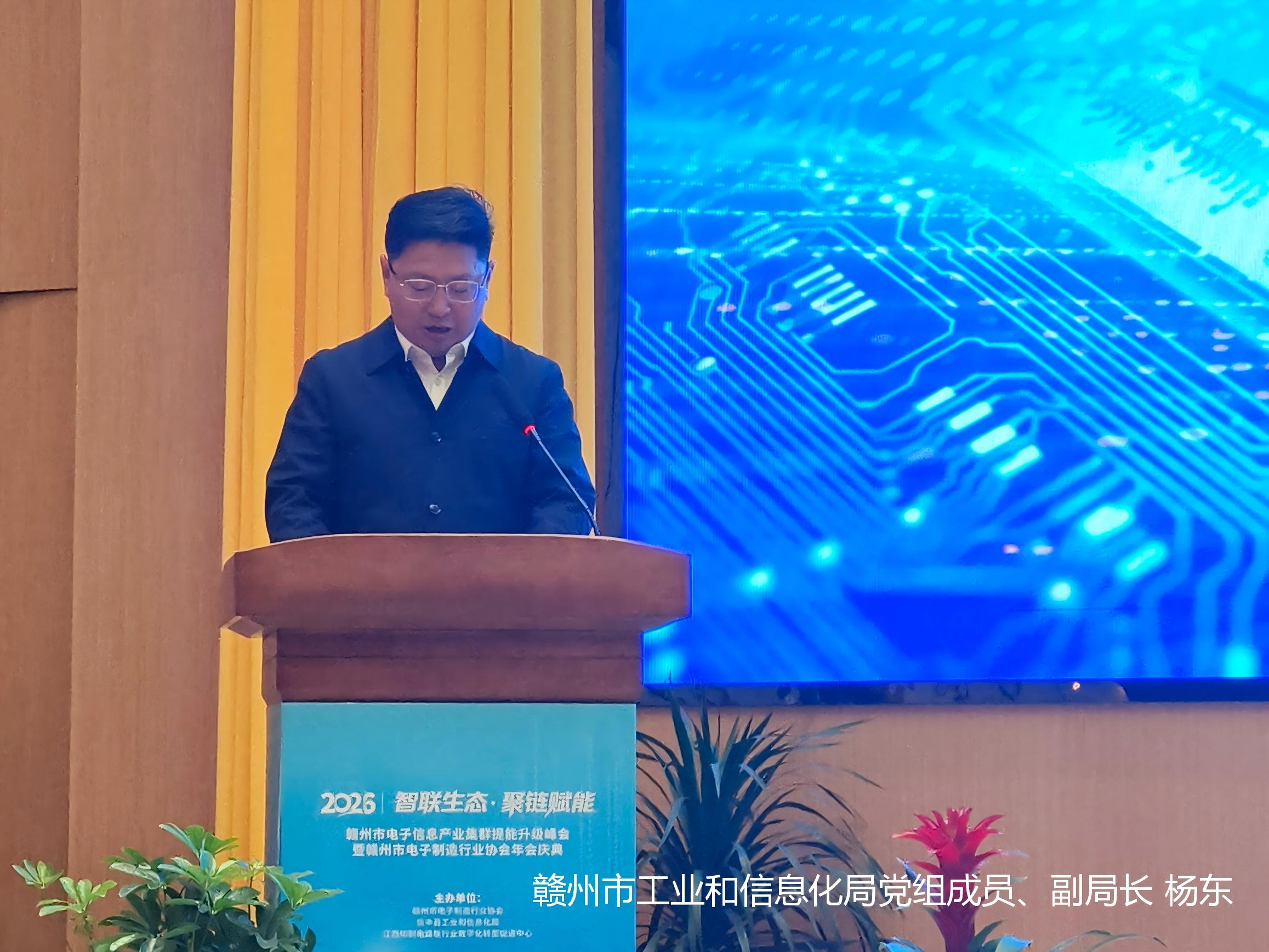 杨东在致辞中表示,过去一年,赣州电子信息产业在复杂环境下承压前行,取得显著成效:产业规模持续攀升,规上企业已达789家,全年营收预计首次突破2100亿元,并在新型显示、PCB等重点领域实现关键突破。面向未来,他提出三点核心期望:一是希望行业协会切实发挥“桥梁纽带、参谋助手、服务平台”作用,深化产业链协同;二是鼓励广大企业坚守创新、主动转型,提升核心竞争力;三是强调市工信局将始终与企业、协会同心同向,持续优化营商环境、落实惠企政策,为产业高质量发展保驾护航。