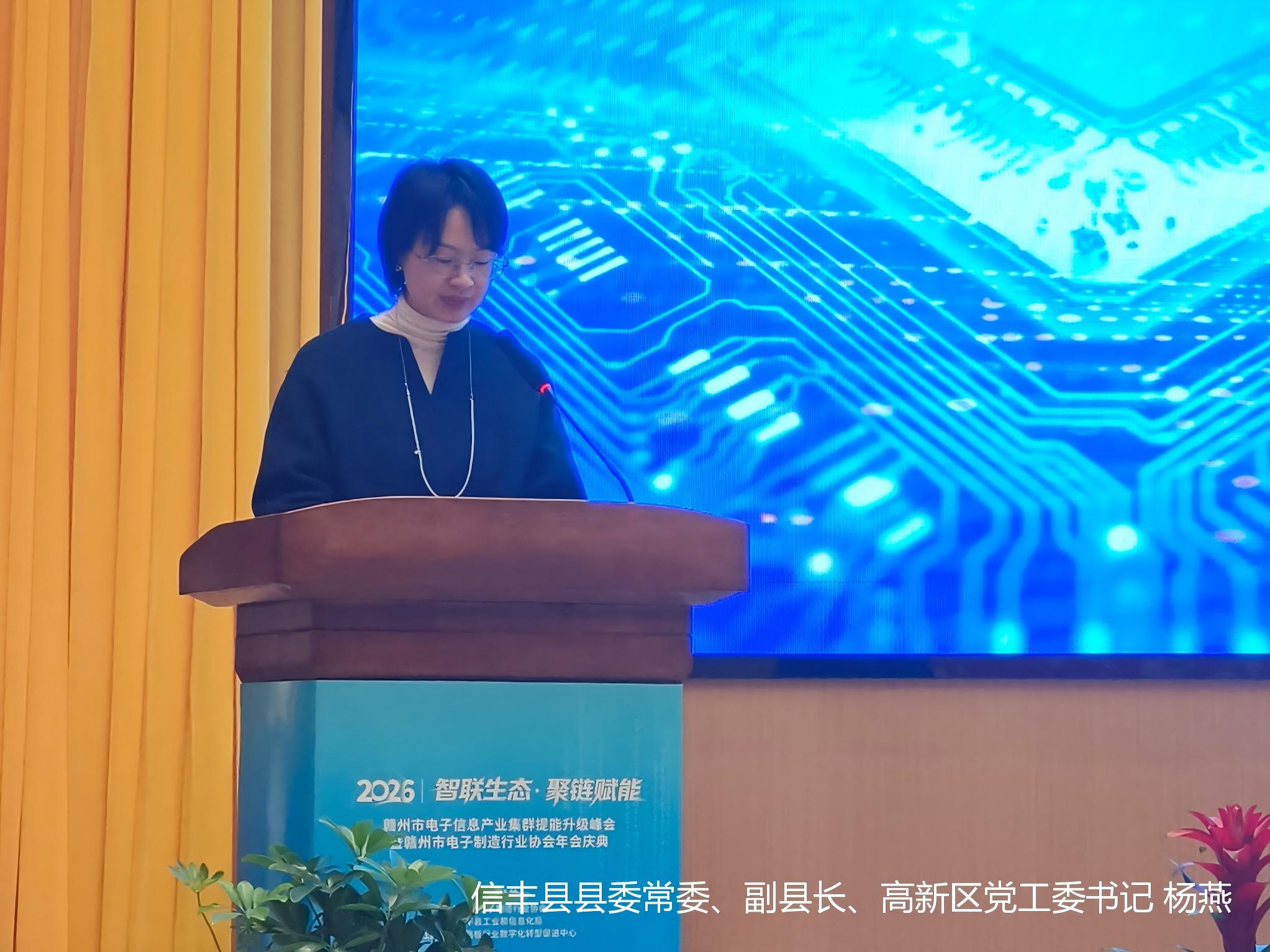 杨燕在致辞中指出,过去一年,信丰县电子信息产业承压前行、政企同心,其中电子信息产值同比增长20.7%,并成功入选全省首批、全市唯一一个经济强县建设县,“中国电子电路产业发展核心区”品牌持续擦亮。当前,信丰已形成从高端覆铜板、精密PCB制造到电子元器件、智能终端装配的完整产业链,集聚了天能集团、景旺电子等34家上市公司及超200家上下游配套企业,正成为承接粤港澳大湾区产业转移、集聚发展要素的热土。信丰将始终以企业需求为导向,持续优化营商环境,并诚挚欢迎广大企业家前来投资兴业、共赢未来。
