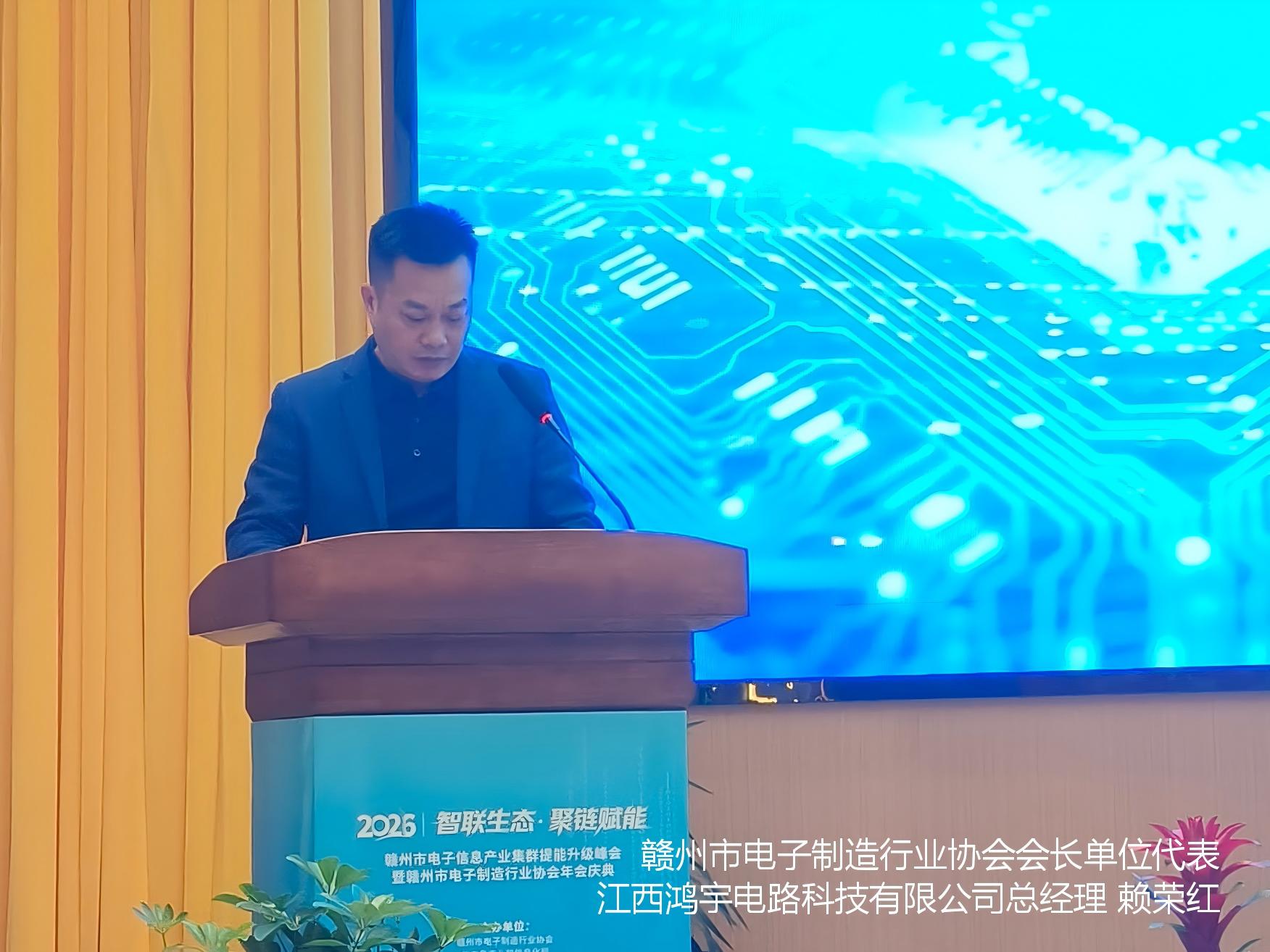 会上,赣州市电子制造行业协会会长单位代表、江西鸿宇电路科技有限公司总经理赖荣红受协会会长委托致辞。