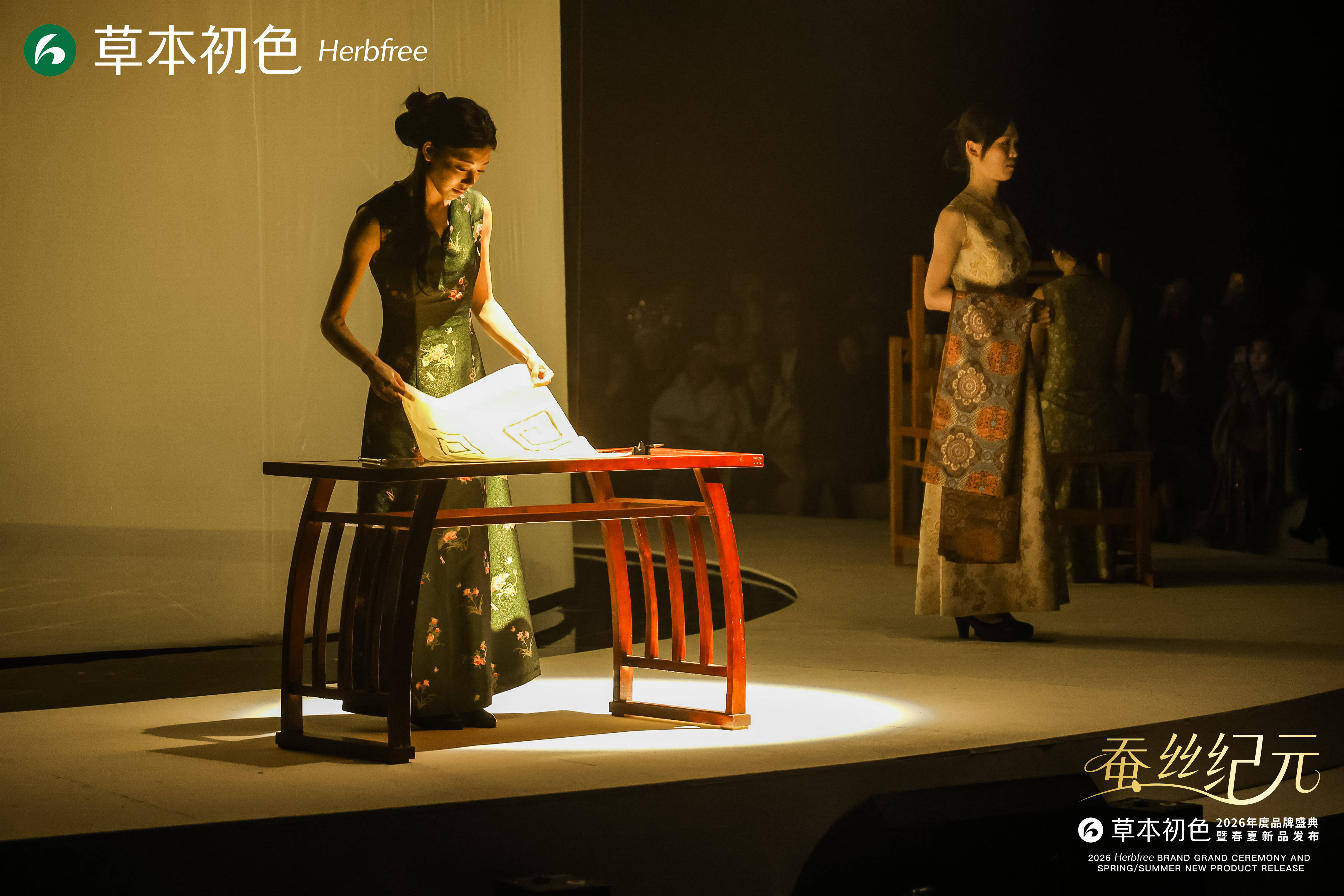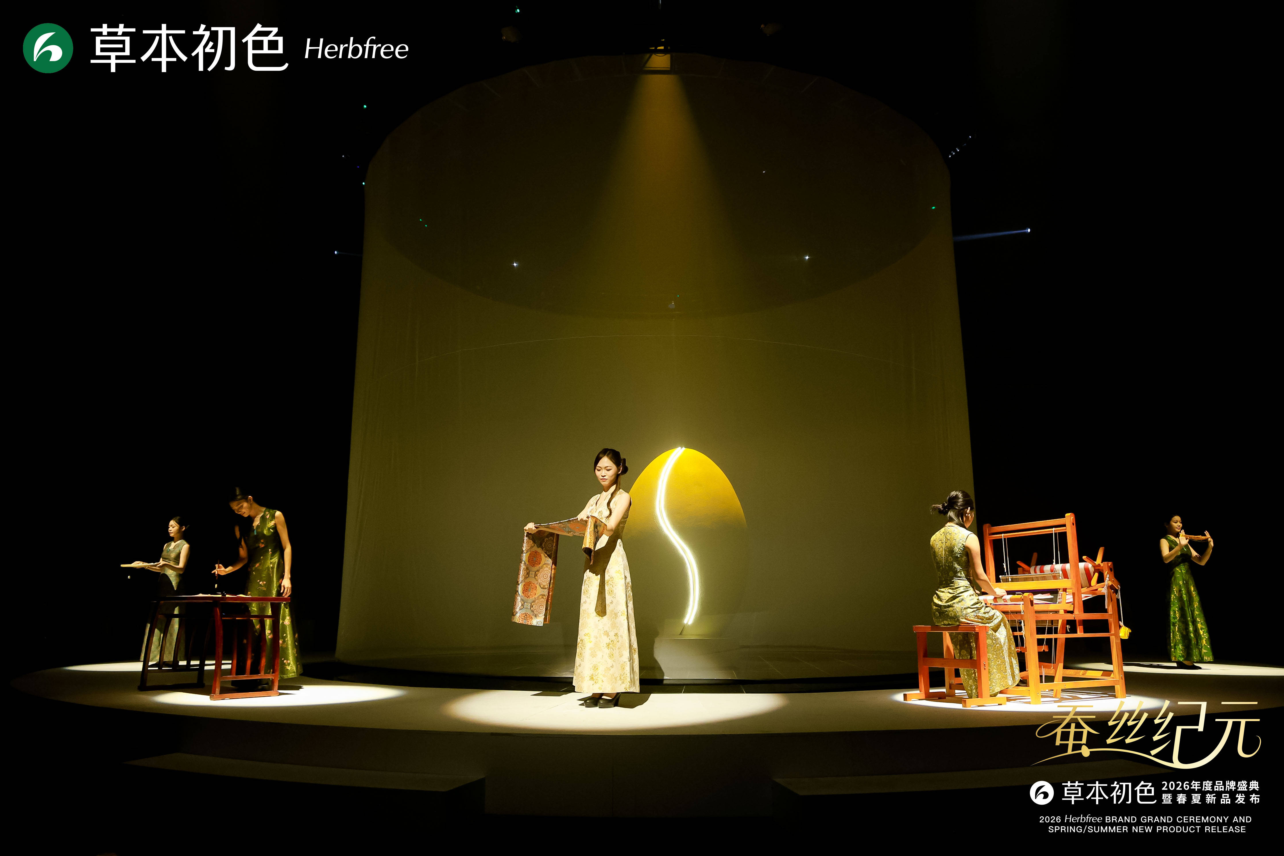 草本初色突破传统秀场边界,将“以蚕丝为脉”具像化表达,深度融合科技与文化,打造沉浸式蚕丝美学空间。发布会首次采用全息影像与360度环绕式舞台技术, 90%透明度的全息纱幕投射出蚕丝生长、蚕蛹破茧、宋锦织造的动态场景,无需3D眼镜即可让嘉宾置身3D幻境,实现视觉、触觉、嗅觉与文化体验的四重升级。现场打造的“丝路映射”艺术打卡区,设置破茧映月、光阴丝缕、锦库回响等六大主题空间,通过实物陈列、互动装置、非遗表演等形式,让嘉宾近距离感受蚕丝文化的深厚底蕴与宋锦技艺的精湛魅力,让秀场成为兼具视觉震撼与文化内涵的盛宴。