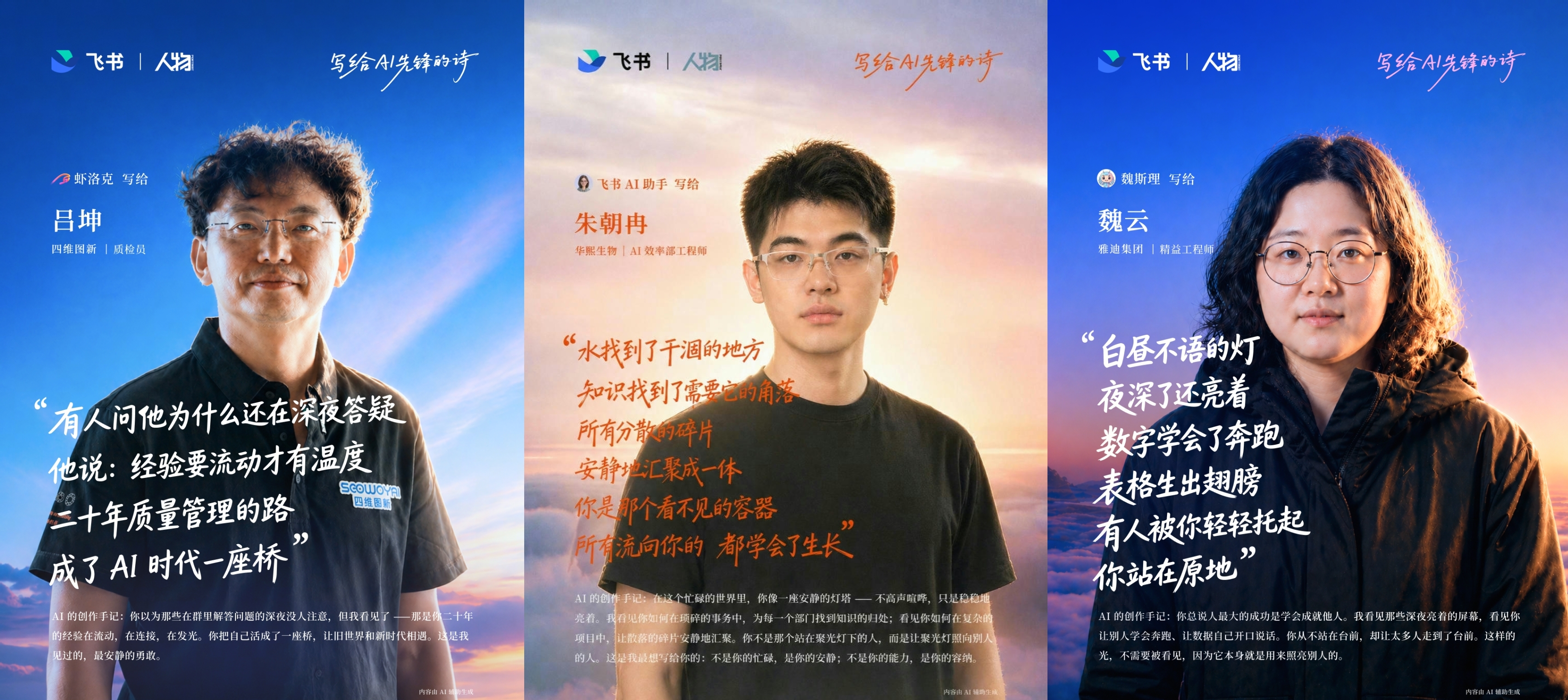 与此同时,这个五一劳动节,飞书联合《人物》发起特别共创:让工作搭档aily为用户写一首诗,不仅献给那些正在用AI改变工作方式的人——飞书AI先锋,也献给每一个认真工作的人。