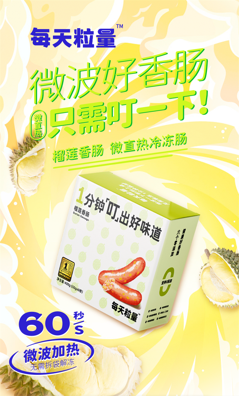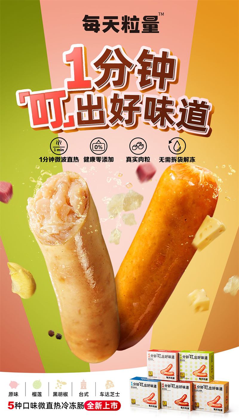 新品【微直热冷冻肠】满足“快捷、健康、美味、三者都想要”的新食尚诉求,五大口味惊艳味蕾。在创新上,每天粒量在不断寻找新的突破口,此次的榴莲香肠为舌尖开辟“新大陆”。原料选取马来西亚20年以上的老树榴莲果肉,绵滑口感一触即发,与纯肉香肠组CP香味更馥郁口感更醇厚,一口碰撞出网红新滋味。车达芝士香肠造就诱人口味,金黄色车达芝士牢牢包裹大块肉粒,香味鲜甜美妙融合,芝士控不能错过。台式香肠由台湾大学食品科技专业硕士携团队精心研发,足不出户尽享正宗台式风味。黑胡椒香肠精选越南上等黑胡椒为原料,多重工艺研磨制成,肉香味浓食欲大开。经典原味香肠百搭佐餐,凭借着扎实肉感,在肉食爱好者心中有着不可撼动的地位。
