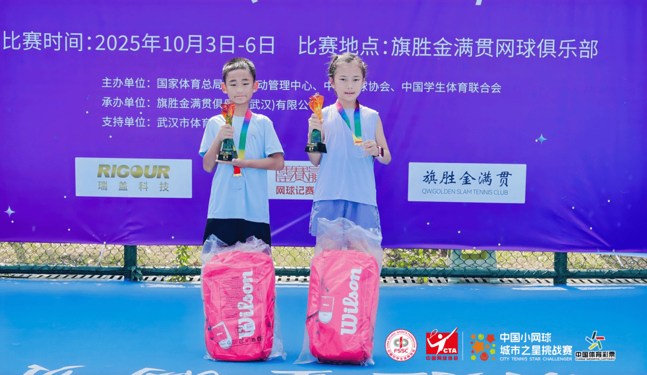 本次赛事由国家体育总局网球运动管理中心、中国网球协会和中国学生体育联合会联合主办,旗胜金满贯网球俱乐部承办,武汉市体育局支持。历经三天的层层淘汰,本次赛事线下 10 个项目的冠军全部产生 ——U10 橙球组、绿球组、标球组,U12 男子组、女子组的单打与双打赛场,处处上演着精彩对决。小球员们奔跑、挥拍、救球,每一个动作都透着专注与执着:有的在落后时咬牙追赶,用一记漂亮的底线击球扭转局势;有的在双打配合中默契十足,用精准的截击赢得掌声;还有的虽未站上领奖台,却在赛后主动与对手握手,展现出超越年龄的体育风度。