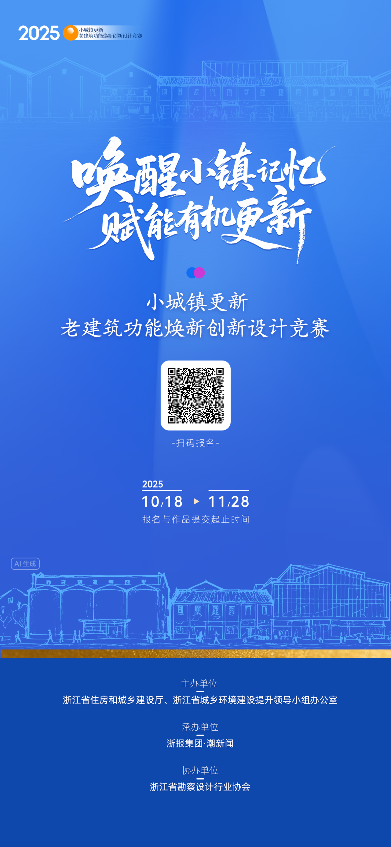 那么,究竟需要怎样的“革新”才能回应时代脉搏、浸润百姓生活?让老建筑既能延续过去的厚重记忆,又能承载未来的生动场景?为深入探索这一命题,由浙江省住房和城乡建设厅、省城乡环境建设提升领导小组办公室主办,浙报集团·潮新闻承办的“唤醒小镇记忆、赋能有机更新——小城镇更新·老建筑功能焕新创新设计竞赛”于2025年10月18日正式启动,面向全社会建筑、规划、景观、公共环境艺术、策划运营等单位的团队或个人开展创新设计竞赛,同时也鼓励高校在校学生报名参加,共同为浙江小城镇的有机更新提升多元视角、注入青春活力。