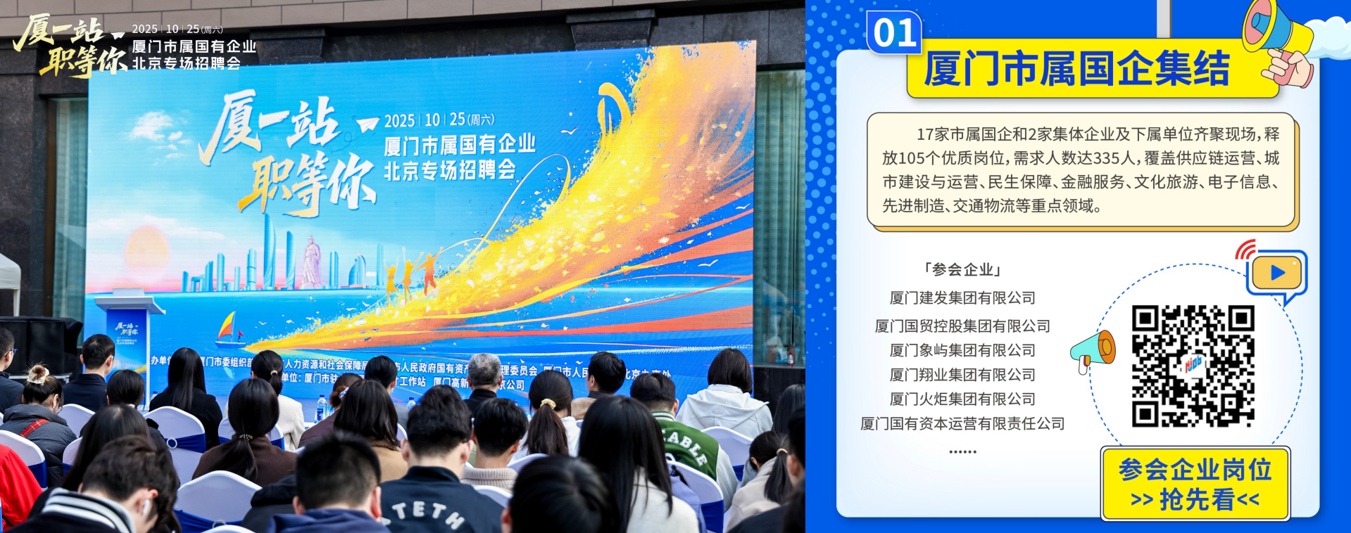 10月25日,“厦一站 职等你”——厦门市属国有企业北京专场招聘会在厦门市人民政府驻北京办事处驻地成功举办。厦门市国资委首次集结19家市属企业,组成“厦门国企天团”集体赴京,拉开厦门国企组团秋招引才序幕。