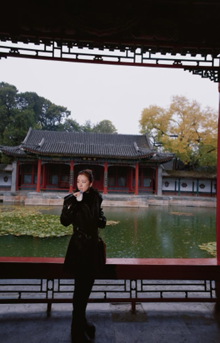 无论是站在琼华岛前的石桥上眺望湖光,还是在古树下微微仰头,凝视着枝叶被雨水洗刷后的沉静,她的每一步都显得那么自在,与古朴的环境和谐共处,毫无明星的架子。