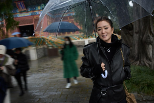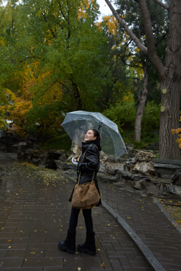 巩俐的身影在京城一场如烟似雾的秋雨中,如同一滴墨,悠然染进了北海公园的写意画卷。