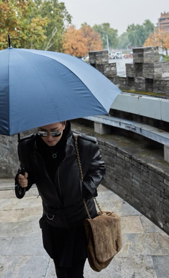 巩俐身着一件黑色皮质短款外套、搭配短裙、黑丝袜和厚底短靴,斜挎着一只大地色系的麂皮包。这套造型带着一丝酷飒,却因雨天和园林的衬托,瞬间卸下了舞台的凌厉,只留下闲适和真性情。