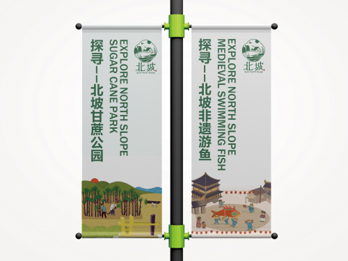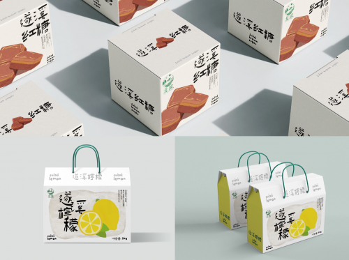 此外,项目还开发了衍生 IP 角色及极简主义包装体系。在 IP 角色设定上,王艺璇将“鱼”和“甘蔗”两大核心元素拟人化,通过简洁的轮廓与夸张比例表达出“活力”“守护”等情感特质,使角色既适用于儿童友好的传播场景,又能够自然融入导视系统与文创产品当中。包装设计则以高度克制的版式与留白为主,提炼出一至两组核心图形元素,与统一控制的字体和色彩搭配使用,使北坡的特产与周边产品在货架与旅游场景中能够一眼被辨认,符合当代消费环境中“可拍照、可分享”的审美与使用需求。