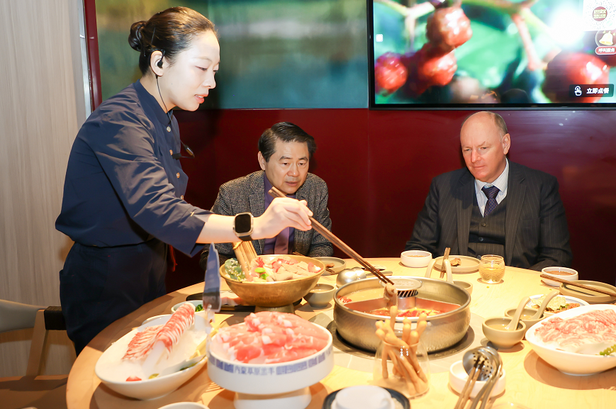 落座后,服务员现场演示了中式火锅特有的“七上八下”烫涮毛肚的手法——短短十几秒间,毛肚变得爽脆可口。乔文博大使表示:“虽然这不是我日常饮食中的常见食材,但它展现出的高品质和可追溯性,正契合新西兰对食品安全与可持续农业的一贯追求。如今它在中国火锅文化中被赋予全新生命,这是一种富有创造力的融合。”他还特别提到店内的野山菌汤锅底:“清淡却不失层次,强调原材本味的做法,与我们倡导的‘clean eating’理念存在一定共鸣——尊重自然、减少加工,让食物本身说话。”