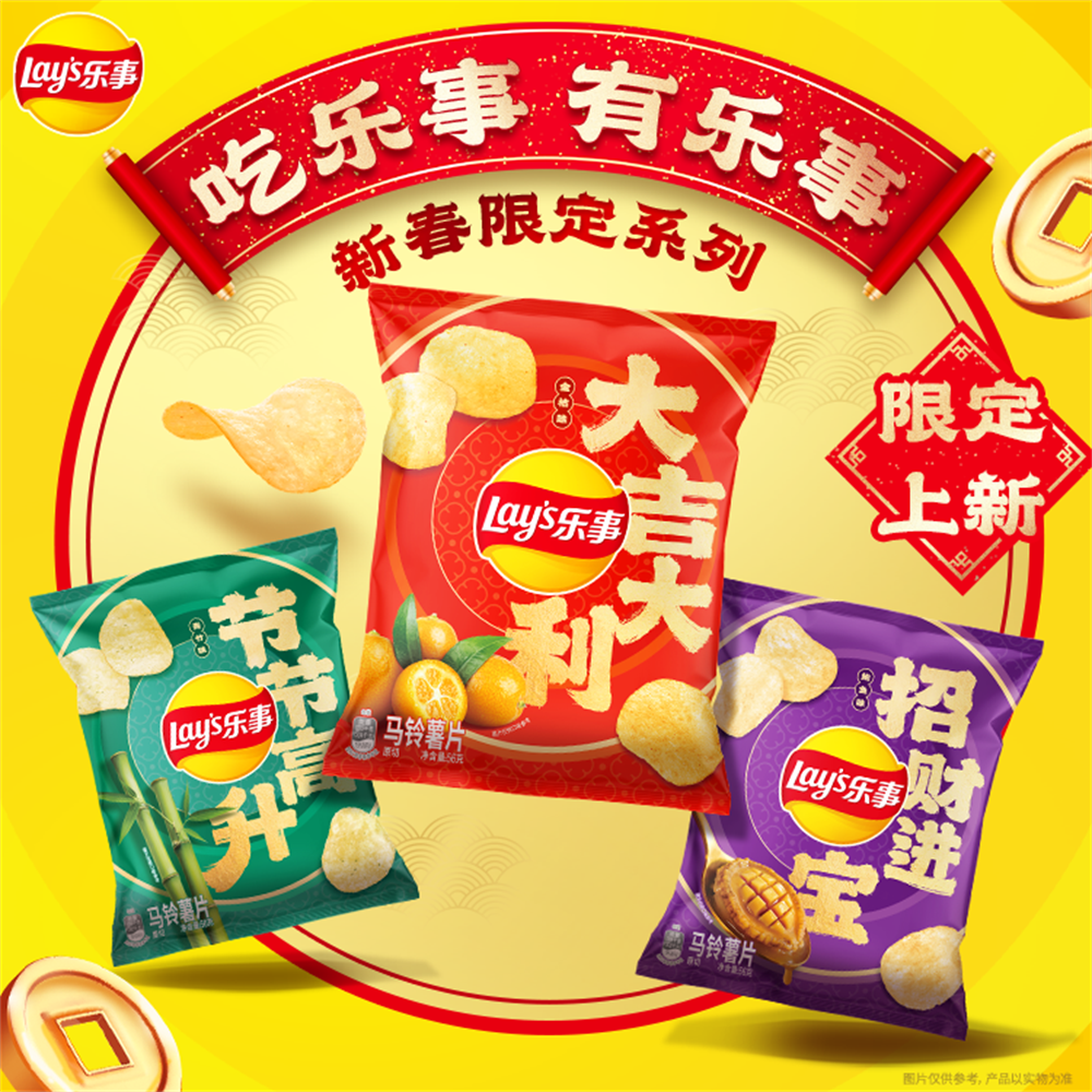 另一方面,乐事推出了渠道限定全新的单包口味,包括“大吉大利”金桔味、“节节高升”青竹味和“招财进宝”鲍鱼味三款限定新品。这三款产品不仅在口味上锐意创新,还将味觉符号与新年祝福巧妙地融为一体。作为礼品,它极具好兆头;作为零食,它美味且解馋,是春节常备零食。