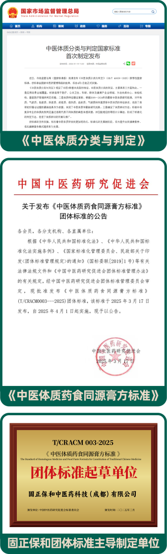 2025年3月17日,由中国中医药研究促进会发布,中国中医科学院中药研究所、固正保和中医医学研究院牵头同制定的《中医体质药食同源膏方标准》(T/CRACM0003--2025)经国家标准化管理委员会审核通过,正式发布实施。
