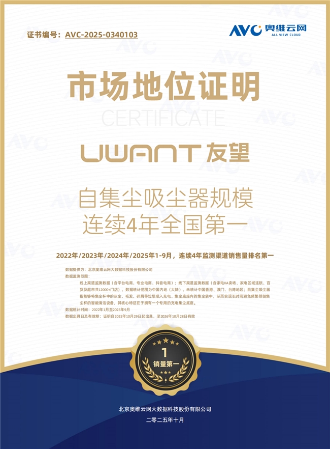 在自集尘吸尘器领域,友望已连续三年位居行业第一。据奥维云网(AVC)市场地位证明显示,在覆盖线上全平台及线下超万家门店的监测网络中,友望稳固居自动集尘吸尘器行业销售额与销量双第一。销量数据背后是产品细节的支撑,友望推入式洗地机的主机重量仅2.2kg,配合免提起的顺坡推入设计,用完轻松一推即可完成充电与自清洁准备。这背后思考的是:“一个妈妈单手抱着孩子时,能不能轻松使用,老人弯腰不便,能不能让他站直一点。”